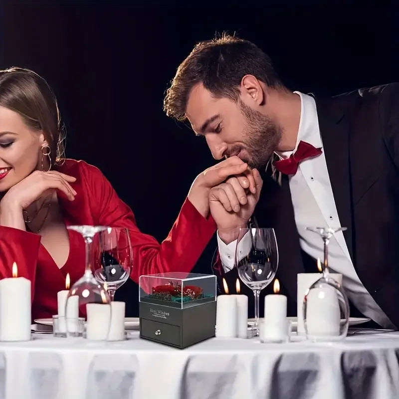 Design Features: Heart-shaped pendant, shimmering finish, elegant rose box with pull-out drawer